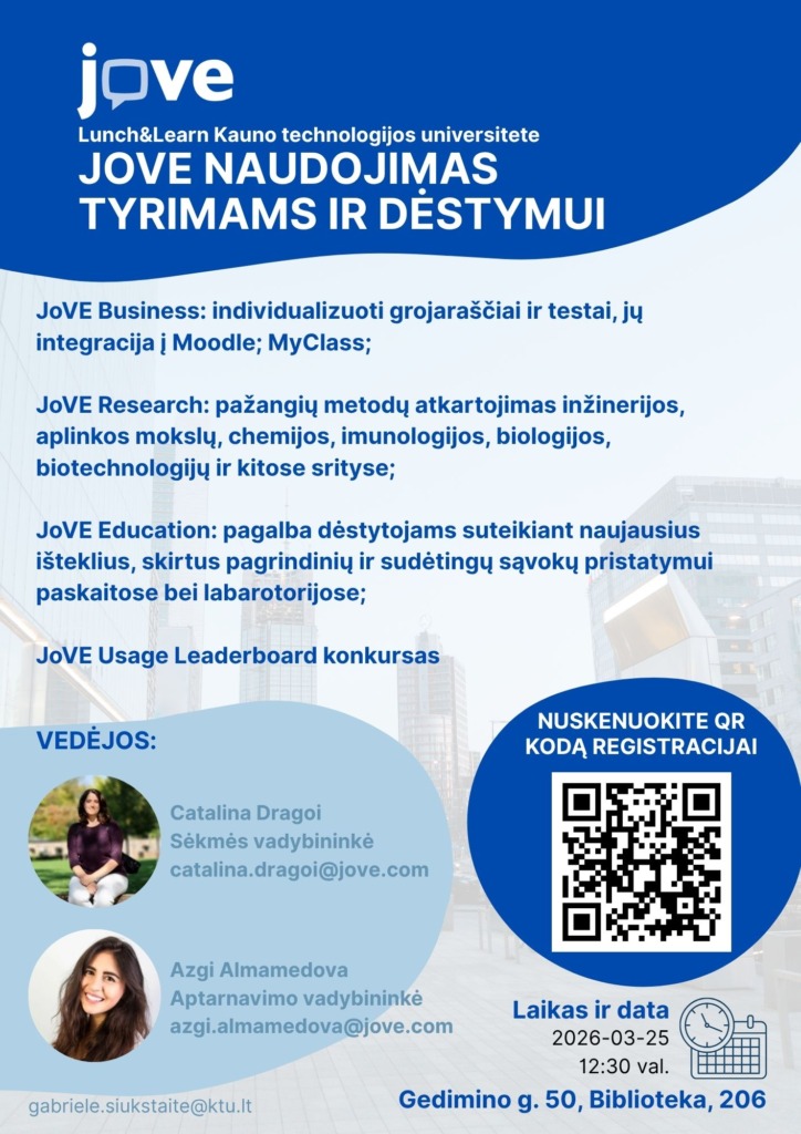 Maloniai kviečiame Ekonomikos ir verslo, Matematikos ir gamtos mokslų, Cheminės technologijos fakultetų dėstytojus susipažinti su KTU prenumeruojama duomenų baze JoVE ir sužinoti, kaip jos išteklius galima panaudoti savo studijų moduliuose, integruoti į Moodle aplinką ir kt.